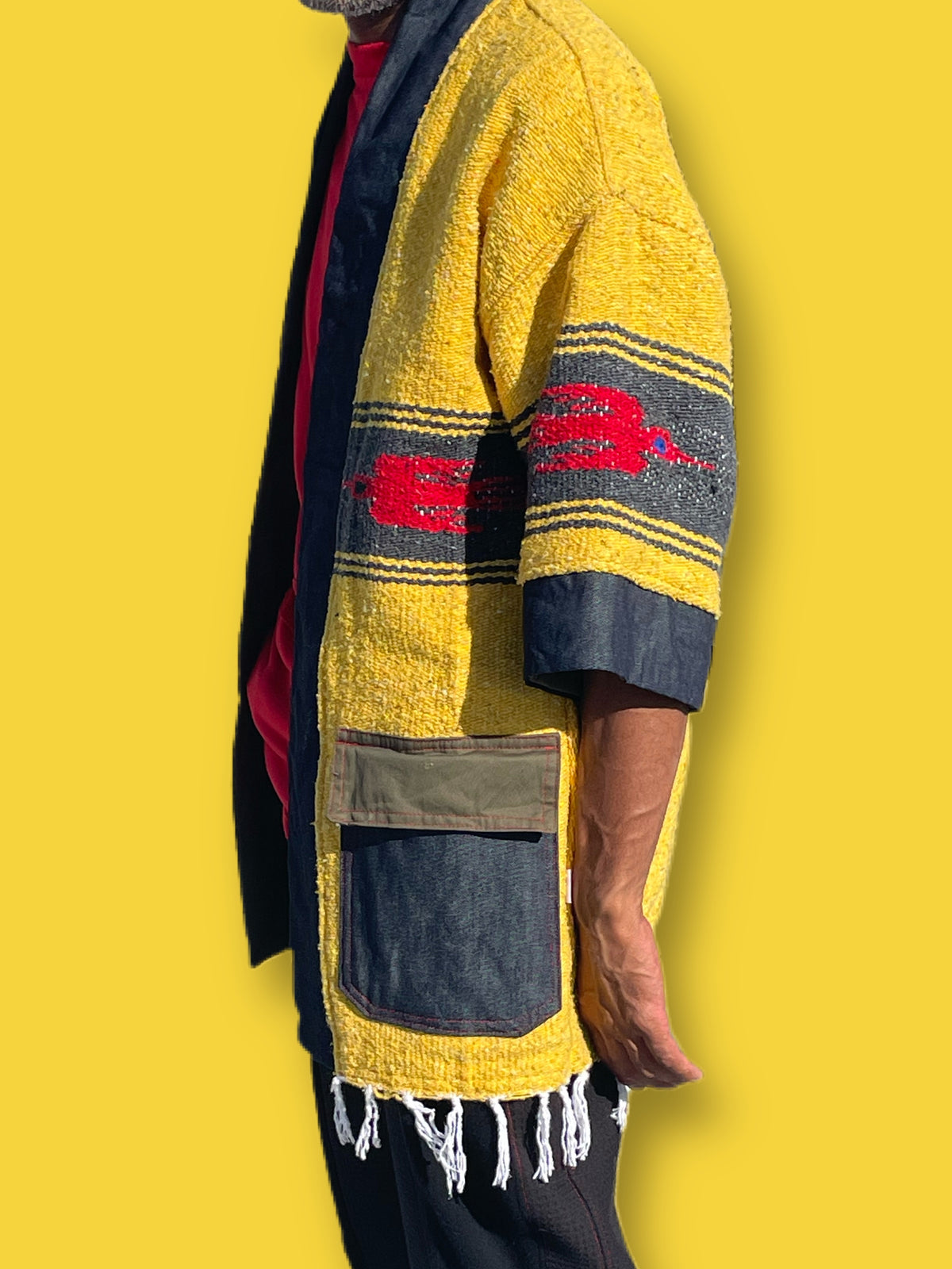 R3 Kimono is Reversible and is able to Pak itself into a bag aka Pak. It was Upcycled from a Mexican Blanket, old denim, camo bag and olive scraps.. Each R3 Kimomo is made to order and is a 5 to 7 business day turnaround and has its own originality and uniqueness