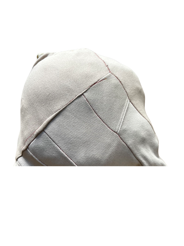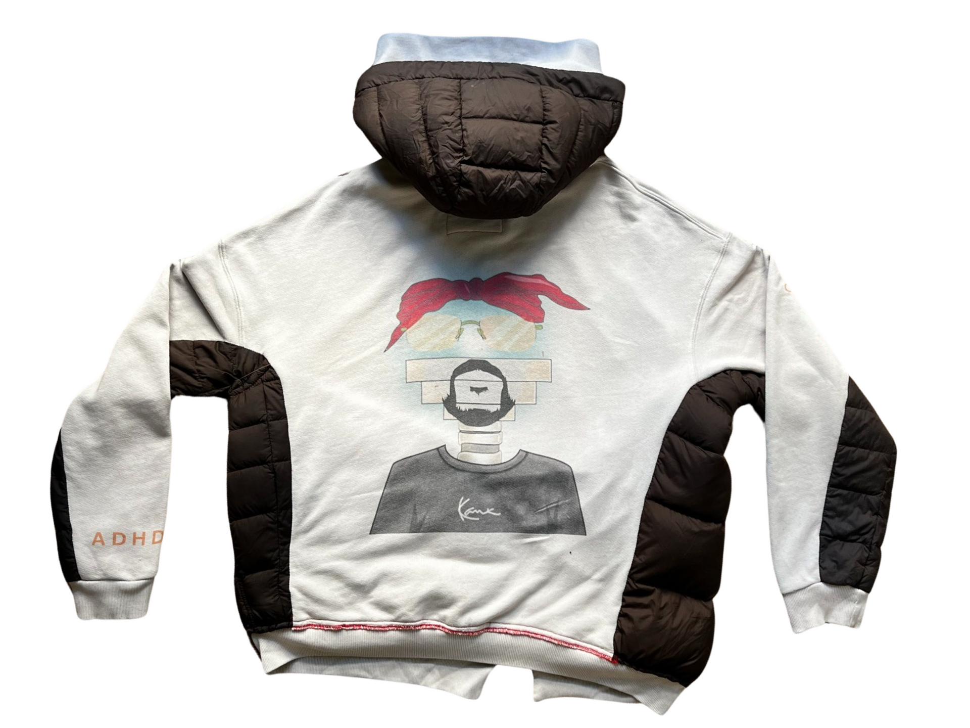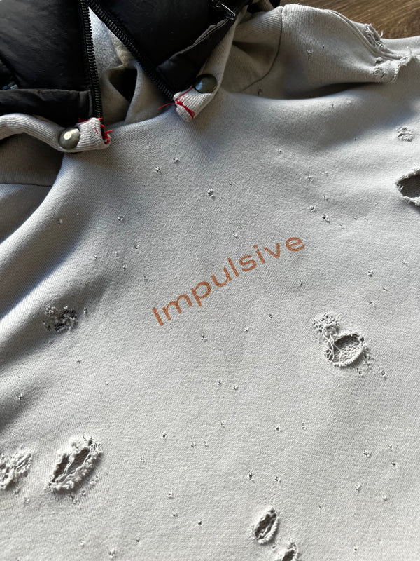 The R3 PacVot is a versatile hoodie that is created from an upcycled Uniqulo Bubble down hoodie. It has been designed with the buyer in mind, offering multiple functionality and the ability to convert into a compact PAK that can easily be tucked away with a removable hood for a double hood feature. This hoodie is a part of ThreadHaus' mental health collection, which aims to turn symptoms into superpowers. The front of the hoodie features the word "impulsive" in the center, while the side sleeve reads "create" and the other sleeve indicates "ADHD". The back of the hoodie references the character of PacVot, who is a part of ThreadHaus' ADHD InnOvoT collection.